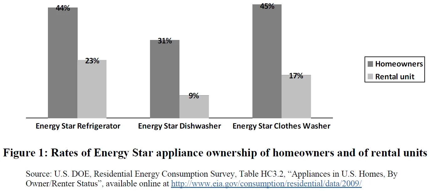 这里发生了什么?戴维斯和莱文认为这是所谓的“房东-租户问题”。简单来说,房东没有太大动力为他们的出租单元购买节能(即:昂贵)电器,因为租户通常自己支付水电费。理论上,房东可以购买高效电器并将成本转嫁为更高的租金,但他们可能很难告诉潜在租户他们在水电费上能节省多少。