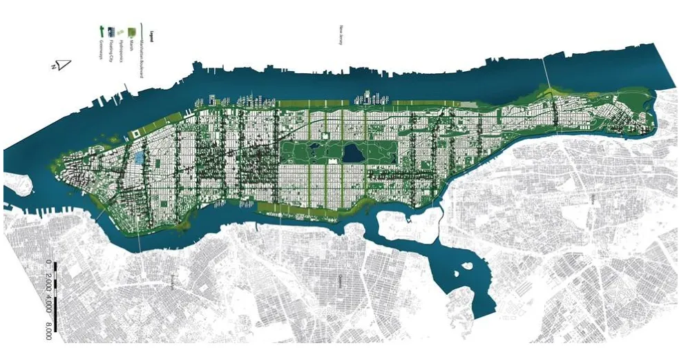 从岛屿的边缘到中心,密歇根团队的概念计划交替设置沼泽、潮汐防护堤、漂浮社区、水培农场和新公园,以防止洪水。它还对洪泛区进行改造,设立水线以上的新基准,以支持服务、应急和电力系统;将众多街道和大道改造成土壤通道,以促进水流出;在城市的洪泛区上方(通常位于岛屿中部)集中高密度开发;新高层建筑的形状反映出增强的风力条件;对现有和新建筑进行“绿化”,以减少各季节的能耗;将整个曼哈顿划为“混合用途”区域,以鼓励人们在家、工作和学校之间步行,从而减少碳排放;整合BRT、轻轨和自行车等地面交通模式,以减少汽车使用;并在地下,平行建设新的地铁,将曼哈顿与各区和地区连接,并设有洪水隧道,以帮助应对风暴潮。