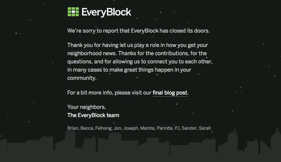彭博社城市实验室贝尔法斯特的中央车站为北爱尔兰的公共交通创造了新时代芝加哥应该考虑所有预算危机的解决方案,普利兹克说消除美国道路死亡的月球计划AOC提议300亿美元的社会住房管理局该网站最初于2008年创建,获得了110万美元的奈特新闻挑战资助,当时自称为“一个 地理过滤器——你所在社区的‘新闻源’,或者,没错,甚至是你所在的街区。”它继续创造性地融合了多种定义的“新闻”,引入了犯罪统计等市民数据、来自另类周刊和电台的文章、Flickr照片和餐厅评论。该网站于2009年被MSNBC.com收购,去年被NBC新闻收购。媒体巨头关闭它的消息在周四意外传出,EveryBlock的主页上简单地发布了公告。以下是那里的部分激烈反应: