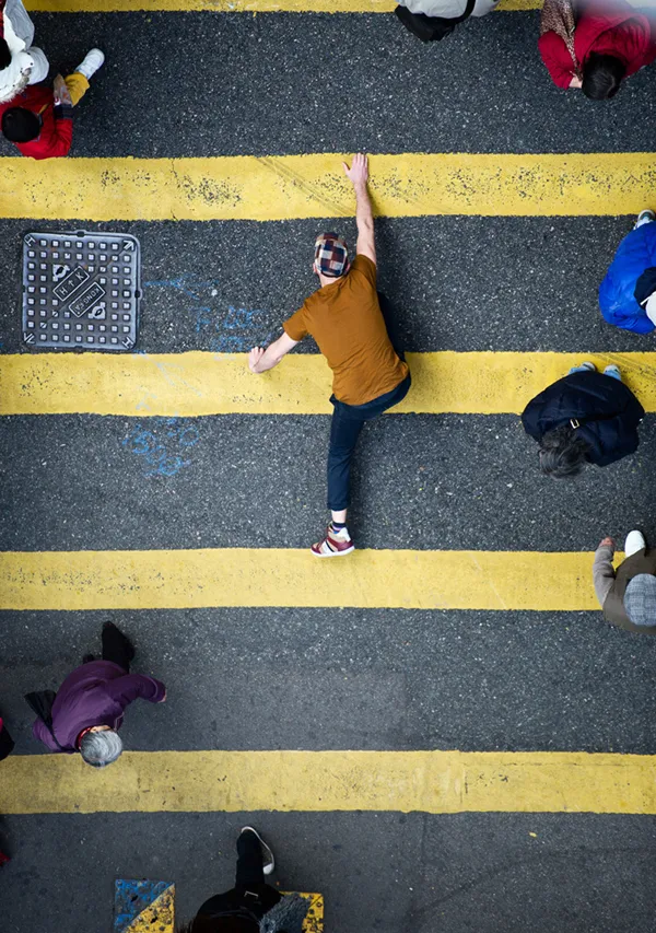 通过在高处使用长焦镜头,Aslund成功地将场景压平,加强了与城市背景下2D游戏的视觉联系,这种背景更像是GTA而非大金刚。他没有雇佣模特,而是使用了照片中的工作人员,并通过对讲机与他们沟通,帮助他们微调姿势。