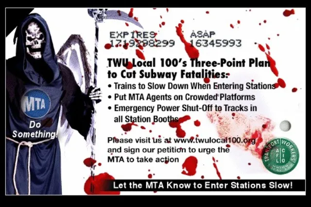 这是一张传单,由MTA最大工会的成员分发,呼吁纽约人签署一份降低进入车站的列车速度的请愿书。