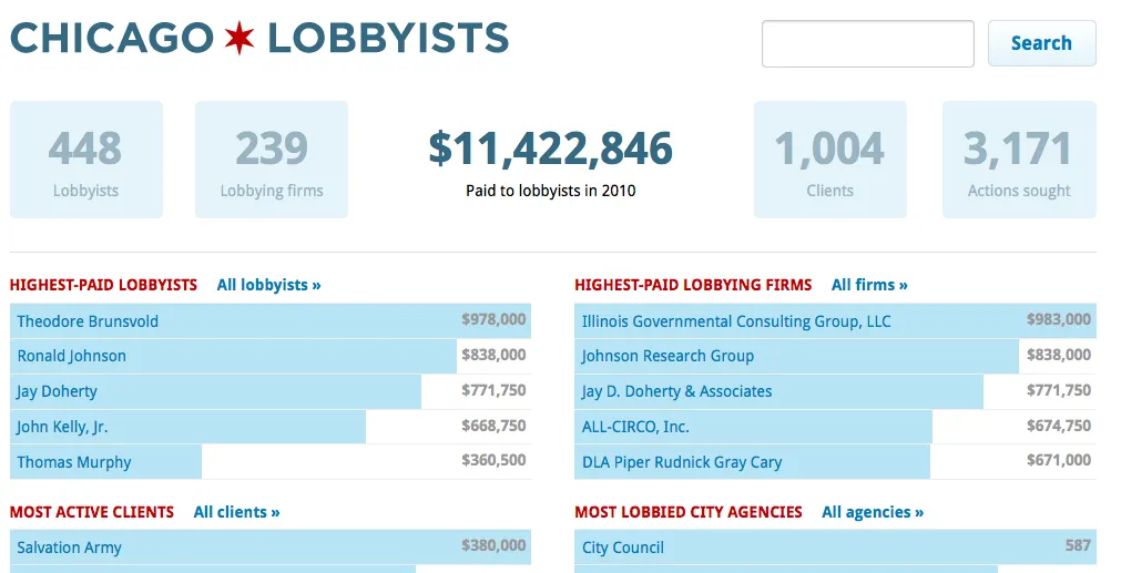 在2011年中期,芝加哥市发布了一大堆关于游说者的内部信息到其开放数据门户。谁支付了他们,他们游说什么,他们游说市政府的哪些部分——所有信息都以电子表格的形式提供,随时可供获取。因此,德里克·埃德尔和一些其他有公民意识的技术同事们获取了这些信息,不久之后,他们以ChicagoLobbyist.org的形式回馈了社会。