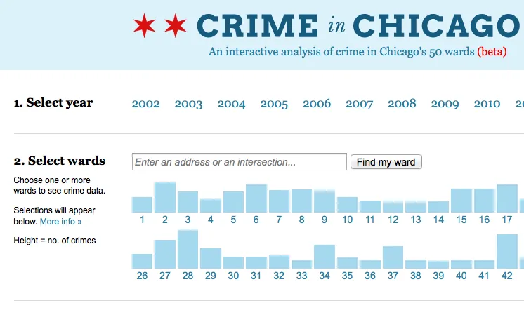 一些项目还具有额外功能。新的 第二城市分区项目是一个互动地图,显示某些建筑的分区情况,既是公众的教学工具,也是开发者在处理特定物业时的便利资源。芝加哥犯罪,追踪过去十年各个区的趋势,可以为公众关于犯罪的讨论提供信息,并将个别悲剧置于更大的背景中。