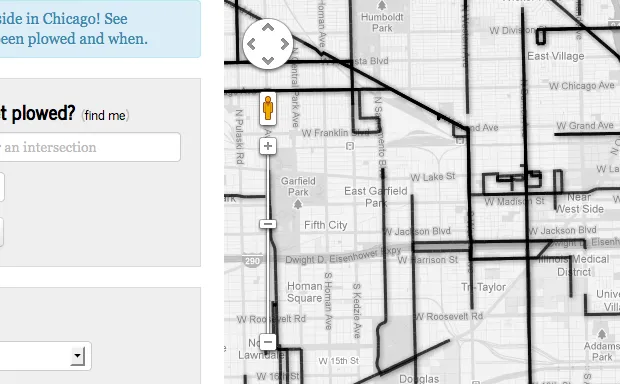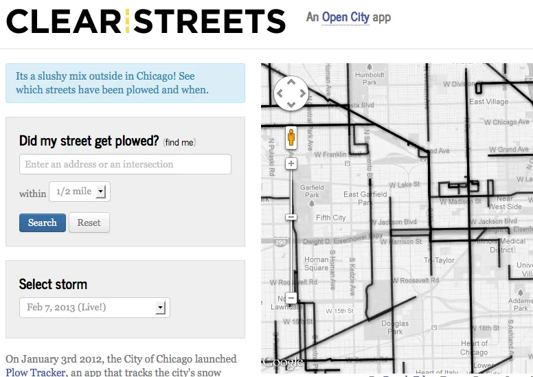 开放城市的项目通常同时实现这两项任务。以 ClearStreets 应用程序为例:开放城市的工作人员利用芝加哥发布的 GPS 数据,跟踪除雪车的行驶路径,并制作了一个实时地图,显示哪些街道已经清理。该应用程序不仅告诉居民他们是否可以顺利到达工作地点,还提醒人们城市除雪系统的庞大规模。