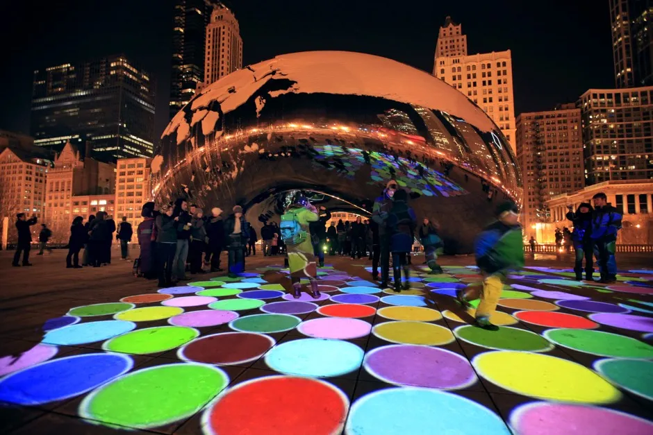 顶部图像:人们在芝加哥的千禧公园查看“发光场”,这是一个投影在云门(也称为“豆子”)上的声音和视频秀。(吉姆·杨/路透社)
