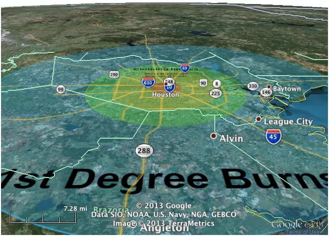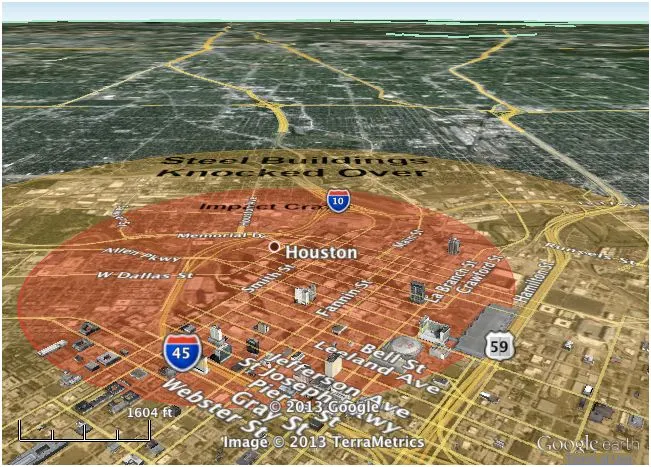 我们将从休斯顿开始,仅仅因为朋友告诉我这是一个相当无聊的居住地。这是一个“较小”小行星(大小相当于一辆校车)造成的损害估计范围。2012 DA14的撞击将更加严厉,因为它的宽度约为165英尺: