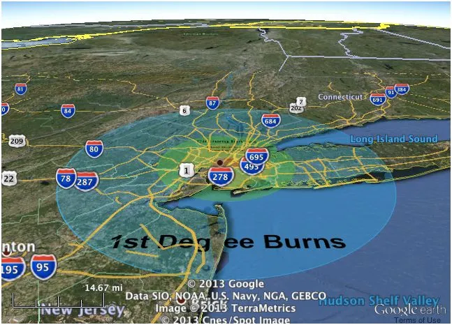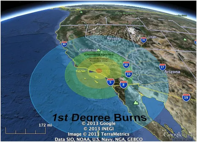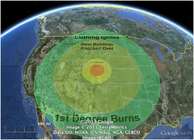 毁灭!假设橙色区域内的每个人都瞬间被杀。外部黄色区域的人们将经历轻微的不便,因为他们的办公大楼像巨大的多米诺骨牌一样倒塌。将小行星的大小调高到“中等”,直径是足球场长度的三倍,您将得到这个可怕的一度烧伤的蓝色环: