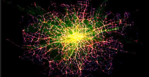戈登使用基本的红绿蓝色谱构建了动画,以允许所有这些发光点的重叠。例如,在一天的中间,市中心呈现黄色,因为那里的大多数人要么在交通中(绿色),要么我们假设他们在办公室(红色)。戈登解释道:“纯白色”是所有的——一切都是满的,很多人都在家里和工作之间通勤。