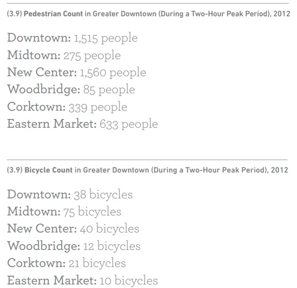 即使在传奇的汽车城,市中心的复兴也至少部分是由希望更理性和高效生活、减少对汽车依赖的人们推动的。报告强调了这一趋势,提供了对大市中心六个主要区域的行人和骑行活动的调查结果(见下表)。