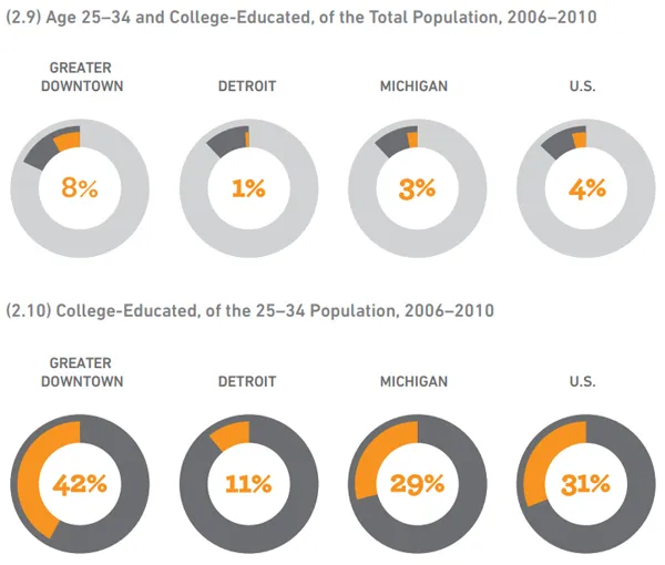 大市中心的居民受教育程度也高于整个城市(见下表)。25至34岁之间的大学学历居民占大市中心人口的8%,而整个城市仅占1%,密歇根州为3%,全国为4%。在大市中心,超过四成的年轻人(42%)拥有大学学历,而整个城市为11%,高于州和全国的29%和31%。