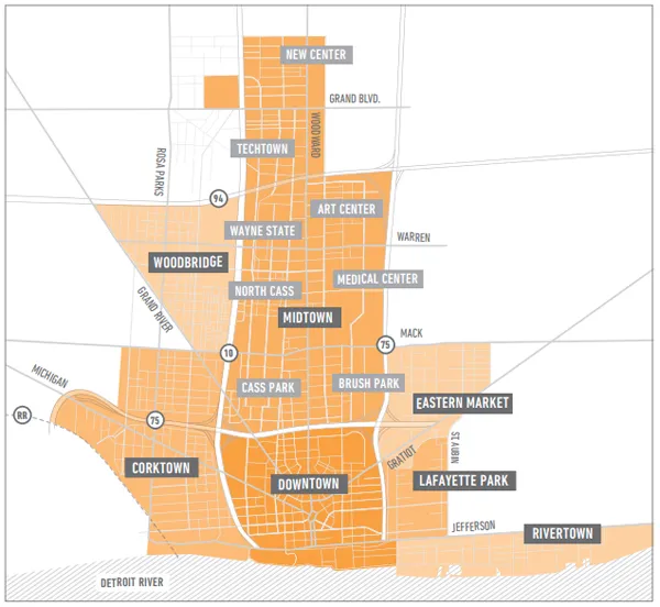 这就是为什么本周发布的关于底特律市中心转型的 报告 [PDF] 如此有趣。它记录了城市核心区域相当大一部分的持续再生。底特律的大市中心面积为7.2平方英里(在报告标题中有所体现)。它从中央商务区延伸到时尚的科克镇,那里是 Slows Bar B Q 和 Astro Coffee 的所在地;米斯·范·德·罗的郁郁葱葱的拉法叶公园和河城,北至东市场,底特律的农贸市场; 卡斯走廊,有艺术机构;中城,韦恩州立大学的所在地,沿伍德沃德大道到科技城和新中心(见下图)。