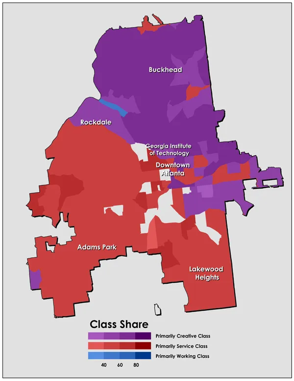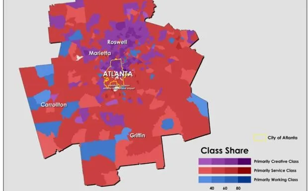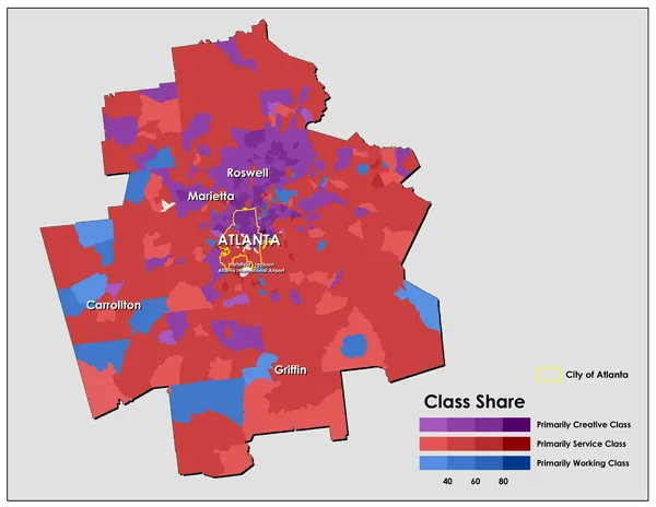 亚特兰大的阶级分化十分明显。类似于华盛顿特区,城市中阶级之间的分界线沿着一个明确的东西轴线划分。大都市区更像一个细胞,创造阶级的核心位于市区,服务阶级环绕其周围,而工人阶级则被推向边缘。