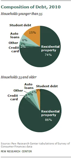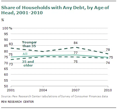 在2007年至2010年间,年轻家庭的中位数债务下降了29%。而由35岁及以上成年人主导的家庭,债务仅下降了8%。目前,年轻家庭中持有任何债务的比例(78%)是自1983年政府首次收集此问题数据以来的最低水平: