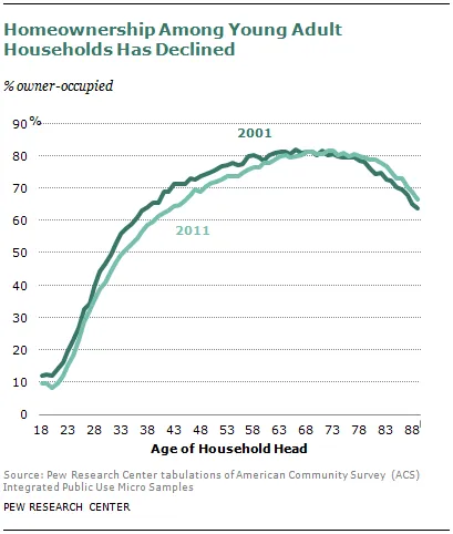 与此同时,在35岁以下的群体中,拥有主要居所的家庭比例从2007年的40%下降到2011年的34%。在2011年,300万最近搬家的房主转而成为租户。报告中的这张图表显示了美国住房拥有状况在短短十年内的变化,因为年轻家庭现在更常选择租房: