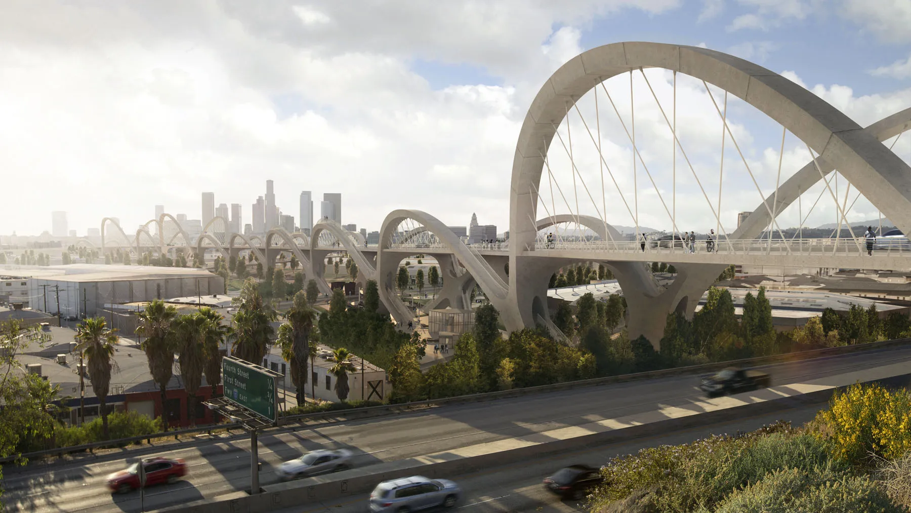 提议的设计旨在为洛杉矶市中心创造一个新的标志。“在重复的混凝土拱门系列中,有梅里尔·巴特勒的回声,”HNTB的首席桥梁工程师泰德·佐利解释道。效果图包括直接通往河流的通道、公园空间以及供骑自行车和行人使用的小径。“我们试图改变汽车优先的等级制度,”佐利说。
