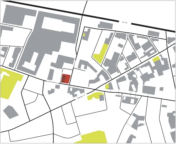 马里斯卡尔的工作室研究了该社区的航拍图像,试图量化其现有的绿地。在这张地图中,所有灰色区域代表地面停车场(同样,拟议的开发项目用红色标记):