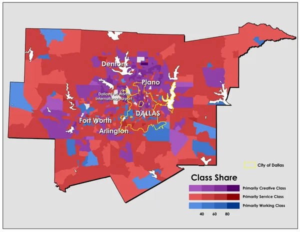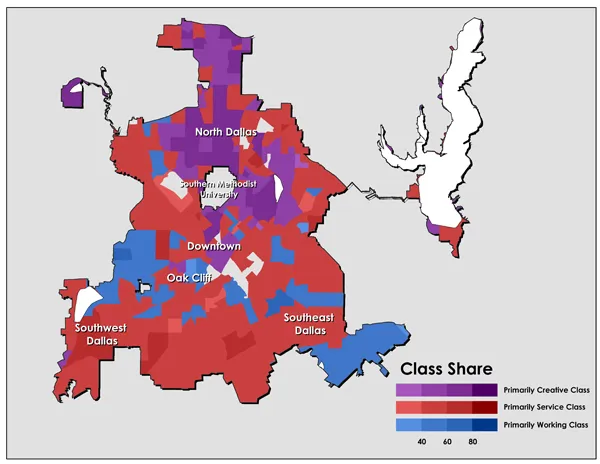 达拉斯市的阶级分化主要沿着由 30 号州际公路和达拉斯市中心令人印象深刻的钢铁和玻璃天际线划定的南北轴线。地图显示,从市中心辐射出的紫色区域向北扩展,而南部则是一片红色(服务阶层地区),夹杂着蓝色(工人阶层地点)。此外,沿着市中心南部的特林蒂河还有一条较小的东西分界线,将河西的工人和服务阶层社区与河东的创意阶层隔开。