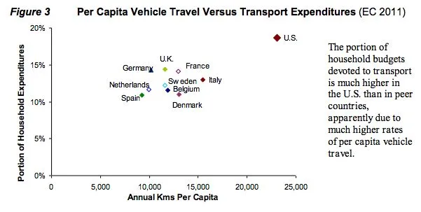 第三张图表将美国的情况与发达的欧洲国家进行对比。美国的家庭交通支出远高于其他国家,这一事实与人均车辆出行有很强的相关性: