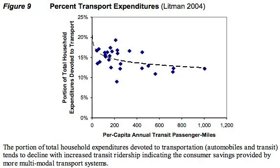 Litman认为,负担能力的重要性超越了普遍的公平,因为人们在交通上的支出无法用于经济的其他领域。这是一个问题,因为交通支出并不像其他投资(例如房地产或个人健康)那样创造财富。Litman引用了两种情境,其中家庭在住房和交通上每年花费20,000美元。将15,000美元用于抵押贷款,5,000美元用于交通,在十年的时间里,创造的财富大约比将10,000美元均分用于抵押贷款和交通多出100,000美元。