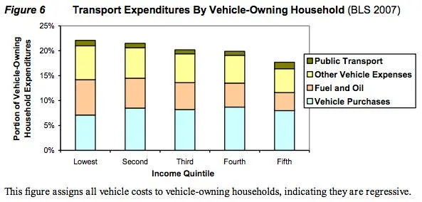 下一个图表显示,汽车拥有是一种累退成本——换句话说,如果你的收入较低,拥有一辆车的成本相对更高: