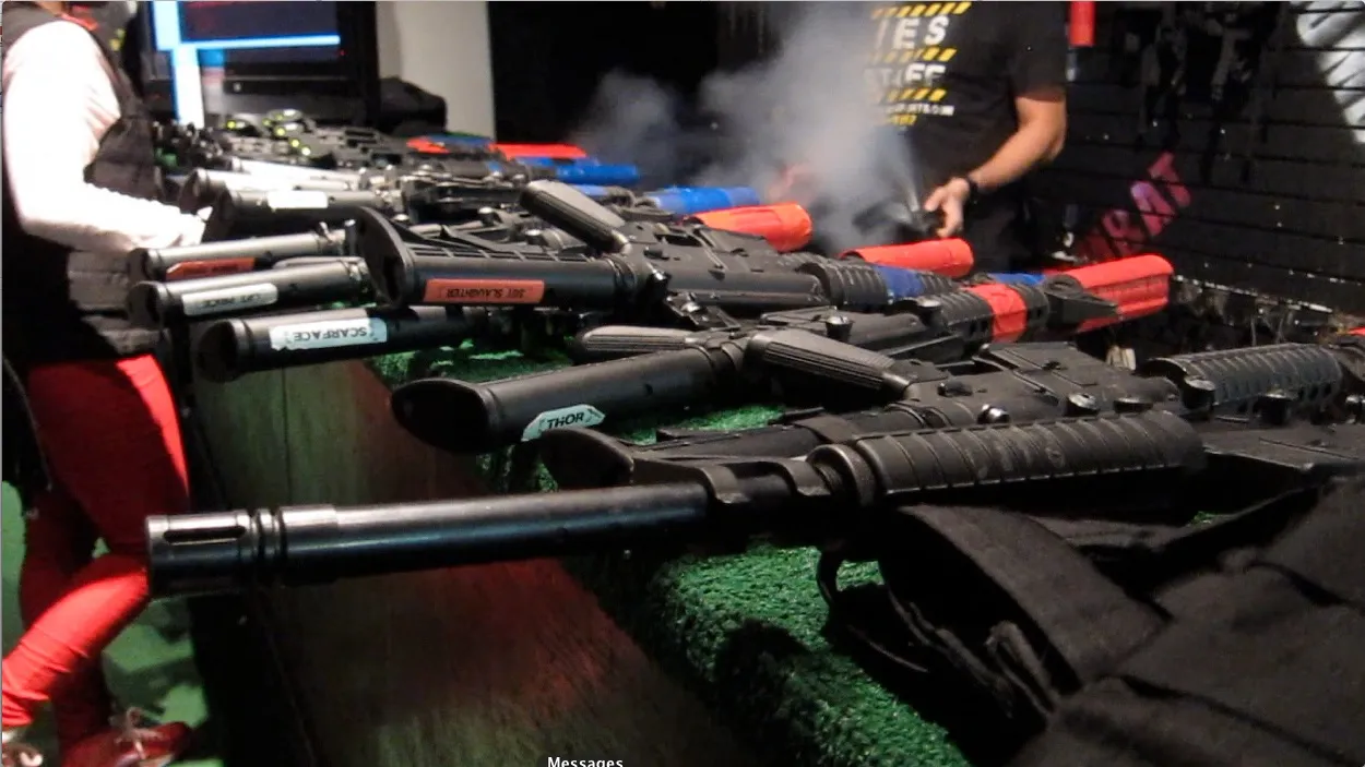 从 报道来看,这个 地方 我原本期待看到穿着 伪装服 的老兵翻阅刀具目录。结果,一个干净利落的青少年给他的Snapple盖上盖子,并在iPad上为我们登记。他带我们穿过一扇门,迎接我们的是一阵喷漆球的轰鸣声和尖叫的孩子们。他们的父亲脸上挂着我在Chuck E. Cheese生日派对上见过的表情:严肃,接受。一个男人抬头用幽怨的眼神看着我,然后继续在一个纸箱披萨盒里翻找。