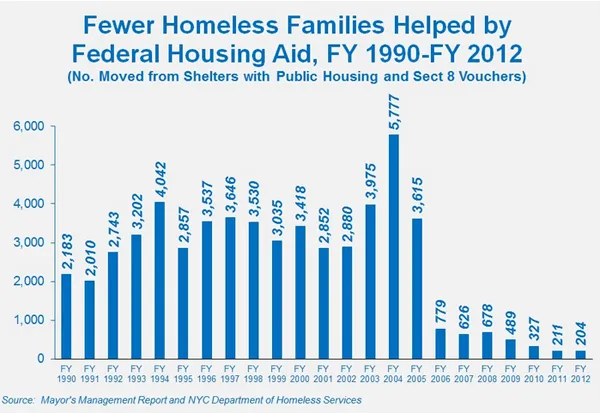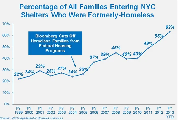 八年前,布隆伯格政府推翻了市长埃德·科赫、大卫·丁金斯和鲁迪·朱利安尼的政策,结束了对无家可归家庭的公共住房和第8节补贴的优先推荐,这些补贴提供联邦租金补助。批评者认为,这项政策通过将无家可归家庭(以及一些其他群体,如家庭暴力受害者)送到公共住房漫长等待名单的前面,激励了无家可归现象。