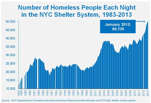 但并非所有纽约人都如此。在2013年1月,纽约无家可归者收容所系统首次记录到平均每晚超过50,000人居住。这一数字在过去一年中上升了19%,自布隆伯格上任以来上升了61%,并且不包括单独安置的桑迪飓风受害者。
