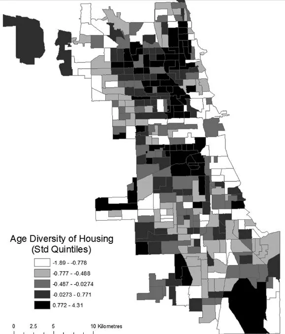 为了填补文献中的这一空白,金研究了包括社区关系测量的芝加哥社区调查。她建立了四个社会联系的指标:凝聚力(共享价值观)、控制(对社区朝着集体利益努力的信念)、代际闭合(成年人照顾当地青少年)和互惠交换(交换好处、建议、信息等)。然后,她将这些信息与住房的“年龄多样性”数据匹配——这是一种逐步重建的代理,因为建筑年龄的混合可能代表邻里演变。