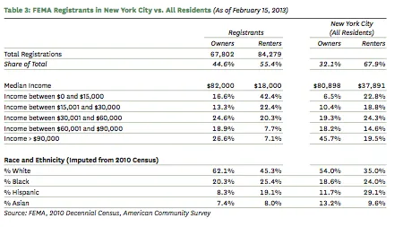 根据本周福曼中心发布的一份报告,68%的申请FEMA的租户家庭年收入低于30,000美元。申请的所有房主中有三分之一的年收入也低于30,000美元。这一比例远高于全市,41.6%的租户和16.9%的房主年收入低于30,000美元。FEMA申请者的中位数收入为房主82,000美元,租户18,000美元。