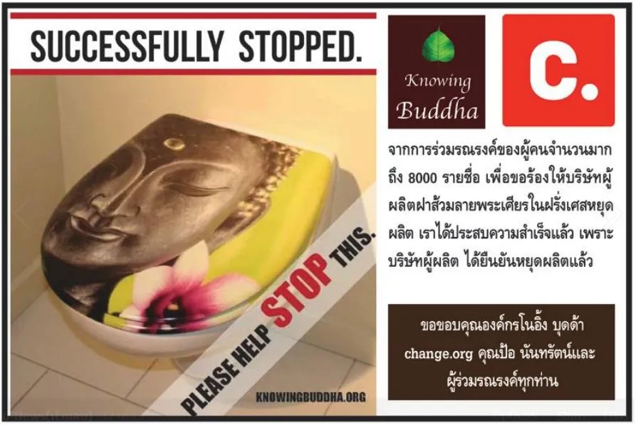 在 Knowing Buddha,愤怒的帖子要求泰国驻法国大使馆迅速采取行动,制止这个可以说是亵渎的厕所。泰国国内政府也参与了这场国际冲突,《曼谷邮报》报道::