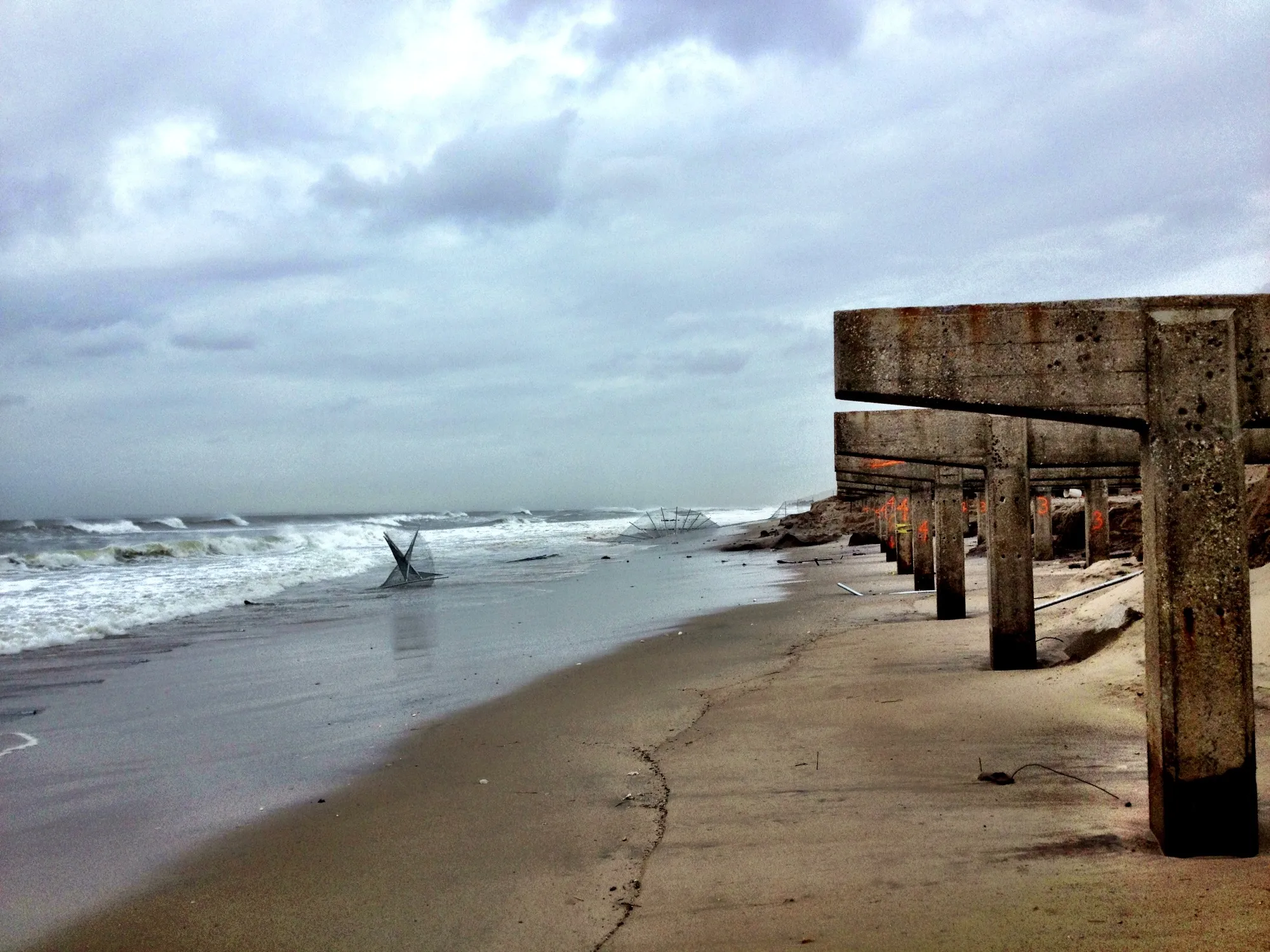 这是一场相对温和的东北风暴,但在86街海滩,这场风暴正将海浪冲击到剩余的海滩上,冲倒了市公园局为保护破损的特许经营摊位而竖起的链条围栏。当我们三人谈论我们所看到的情况时,必须在海浪和风声中大声喊叫,有时我们不得不爬上旁边裸露支柱的崩塌沙丘,以避免被翻滚的海水卷走。