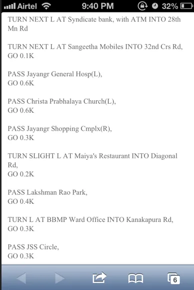 “人们不习惯使用地图。”另一个障碍是文化。“人们不习惯使用地图,”Rahul解释道。在印度,给出方向是一种习惯性的艺术,经过充分练习,通常不遵循正式的规范。他继续说:“我可以保证,没有人会说,‘往南走。’”人们会用一系列路线和熟悉的地标来引导迷路的人,而不是使用方位。对于新来者来说,方向(“直走,直走,左转”)可能毫无效果。而且,我很快发现,对于说同一种母语的人来说,这些方向也同样无效。因此,Rahul和他的团队着手创建一个适合印度的定位工具。Latlong提供自动化的方向,“像正常朋友一样引导人们,”正如Rahul所说。在大约一英里外,我在短信中输入了他们办公室的名称,另一条信息迅速回复给我。它给出了距离(以公里为单位)和如果我叫了三轮车的费用。然后它给出了详细的方向:在一家办公用品店右转,经过一家医院,再右转两次,一次在手机店,一次在银行。它们很有帮助,尽管在这个不断变化的城市中,一些地标可能这一周存在,下一周就消失了。Latlong的方向模仿了口语。他们建议我在一个“死胡同”处左转,这个词在班加罗尔并不意味着你想的那样。在南方城市,环形交叉口被称为“圆圈”,但在新德里和孟买,它被称为“chowk”。Ola Cabs,一家班加罗尔的出租车服务,最近与另一家初创公司合作,提供类似的创新。如果你拨打“未接来电”,也就是无成本的挂断,他们会回复你出租车的距离和位置。