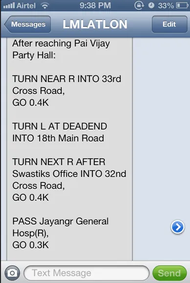“人们不习惯使用地图。”另一个障碍是文化。“人们不习惯使用地图,”Rahul解释道。在印度,给出方向是一种习惯性的艺术,经过充分练习,通常不遵循正式的规范。他继续说:“我可以保证,没有人会说,‘往南走。’”人们会用一系列路线和熟悉的地标来引导迷路的人,而不是使用方位。对于新来者来说,方向(“直走,直走,左转”)可能毫无效果。而且,我很快发现,对于说同一种母语的人来说,这些方向也同样无效。因此,Rahul和他的团队着手创建一个适合印度的定位工具。Latlong提供自动化的方向,“像正常朋友一样引导人们,”正如Rahul所说。在大约一英里外,我在短信中输入了他们办公室的名称,另一条信息迅速回复给我。它给出了距离(以公里为单位)和如果我叫了三轮车的费用。然后它给出了详细的方向:在一家办公用品店右转,经过一家医院,再右转两次,一次在手机店,一次在银行。它们很有帮助,尽管在这个不断变化的城市中,一些地标可能这一周存在,下一周就消失了。Latlong的方向模仿了口语。他们建议我在一个“死胡同”处左转,这个词在班加罗尔并不意味着你想的那样。在南方城市,环形交叉口被称为“圆圈”,但在新德里和孟买,它被称为“chowk”。Ola Cabs,一家班加罗尔的出租车服务,最近与另一家初创公司合作,提供类似的创新。如果你拨打“未接来电”,也就是无成本的挂断,他们会回复你出租车的距离和位置。