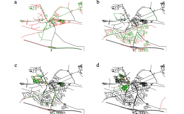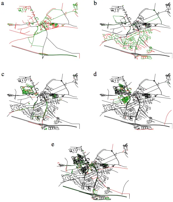 来自 “分析OpenStreetMap网络的增长”,作者为Corcoran、Mooney和Bertolotto,发表于 空间统计。这些数字对应于日期01-11-07、01-02-09、01-03-09、01-07-09、01-09-09和01-10-11。