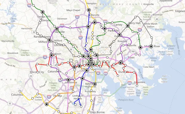 他上面的地图是为了类似于这个充满希望的地铁系统而绘制的,该系统是由大巴尔的摩委员会作为其2030年城市愿景的一部分所勾勒的。为了在三明治店的交汇处建模类似的东西,尼尔森使用了巴尔的摩市的每一个Subway,以及巴尔的摩县的所有Subway,除了两个(他表示,另外两个位于县的北部农村地区,显然在那里开设地铁线路没有意义)。此外,还有一些来自安妮阿伦德尔县和霍华德县的Subway。