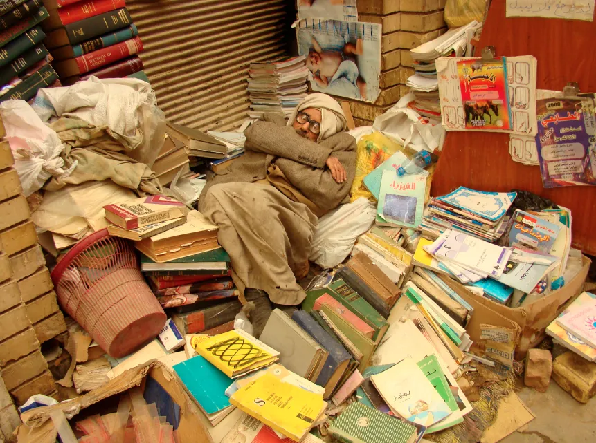 *一名男子在巴格达的穆塔纳比街上卖书。卡马尔·哈希姆(左侧照片中的摄影师)游历著名街道,用他的单反相机拍摄巴格达人。他是获得多个地方奖项的最年轻的伊拉克摄影师, 据伊拉克摄影协会称。(路透社)*街道上挤满了外国豪华车,甚至(偶尔)还有骑自行车的人。这里有一个新兴的 夜总会场景,骑着装饰着迪斯科球的船在底格里斯河上游玩是这座城市年轻人的时尚活动。