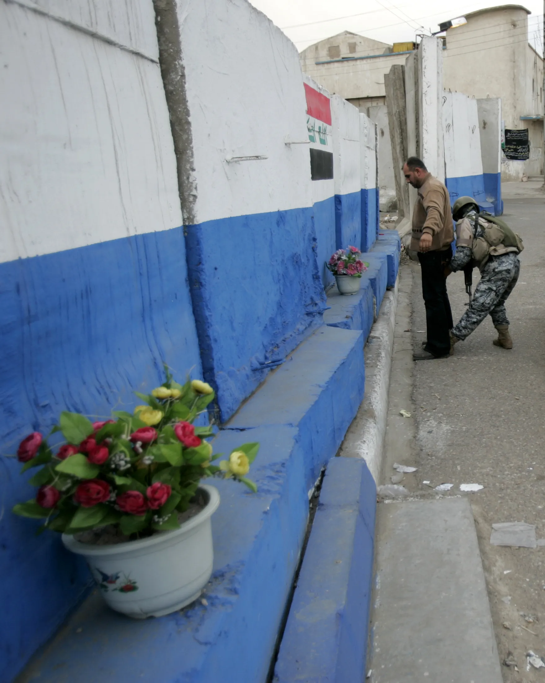 一名伊拉克警察在2009年1月18日巴格达的一个装饰着塑料花和涂漆爆炸墙的检查站示意一辆车辆(未拍摄)停下。花朵和涂料无法掩盖伊拉克检查站混凝土爆炸墙上的子弹和弹片痕迹,像23岁的Jawad Jaddou这样的新兵在执行世界上最危险的工作时面临频繁的攻击。爆炸墙上的文字写着:“代表法律的人必须尊重法律”和“法律高于一切”。Bassim Shati/路透社而安全并没有以任何持久的方式回到这座城市。军用车辆仍然潜伏在每个角落,谋杀和爆炸频繁发生。正如布莱尔所解释的: