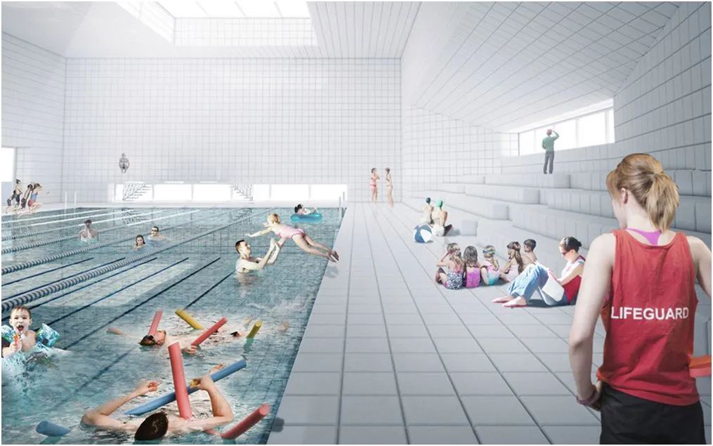 所以科瓦尔斯基构思了一种新型图书馆,他希望有一天能在摩西纳建成,这个小镇位于 波兹南 正南方。在它的第一层,完全是图书馆:读者们坐在时尚的凳子上,周围是成堆的书籍。但接下来就变得奇怪了:在图书馆的中央有一个装满水和挣扎的人体的玻璃柱子。上到一层,你突然置身于一个巨大的游泳设施中,配有一条蜿蜒的水滑梯,让欢呼的游泳者在建筑内外畅游。