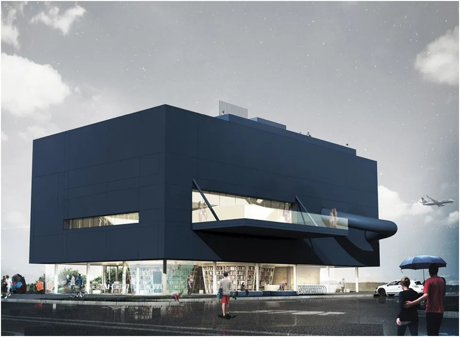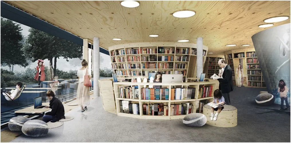 科瓦尔斯基在查看了显示波兰人“很少表示”希望建造新图书馆的调查后,开始思考他那水上阅读的奇幻乐园。相反,他们希望看到更多的体育馆、游泳池、幼儿园和零售店。因此,这位建筑师决定为公众提供一个有趣的理由,让他们反复光顾这个多功能图书馆设施。如果恰好游泳者从游泳池的更衣室出来时,强烈渴望阅读汉斯·法拉达的作品,那只是建筑设计的一个愉快副作用。