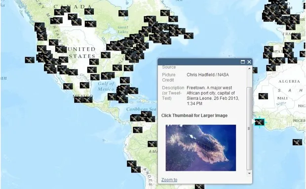 大卫·麦克林在 劳伦斯镇的诺瓦斯科舍社区学院教授计算机制图,他对哈德菲尔德的每日照片感到惊叹,认为,正如 渥太华公民报报道的那样,“如果有一个目录来记录它们的位置不是很好吗?”于是他制作了一个,使用了由 Esri托管的底图和一个他与学生不断更新的Google Drive位置数据库。你可以放大城市,查看哈德菲尔德的全尺寸照片,以及他与这些照片一起发布的评论。(其中一些图片是由他的同事宇航员 托马斯·H·马什本拍摄的。)另一个选项让你可以将底图切换到不同的设置,如“街道”、“必应地图航空”和“国家地理”。