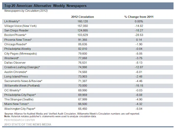 这在作家圈子里是令人悲伤的消息——尤其是在同一周,皮尤研究中心发布了一份令人沮丧的关于另类周刊行业现状的新报告。2012年,国内20大另类周刊中的每一家都失去了发行量(在此之前它们已经连续多年在减少),只有一个例外。 凤凰新时报微微增长了0.14%。
