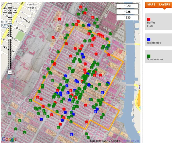 由数字哈莱姆制作的1925年哈莱姆夜生活地图。由斯蒂芬·罗伯逊提供。