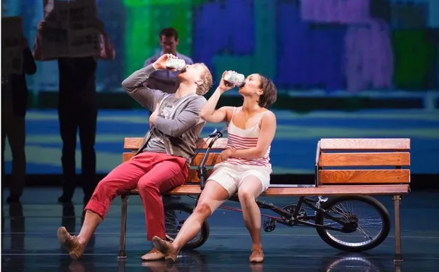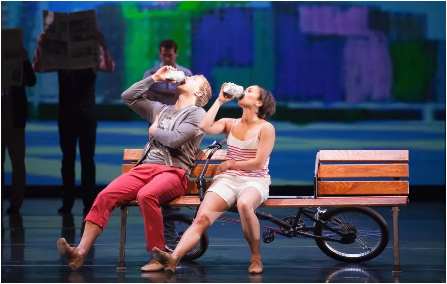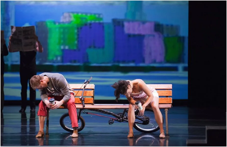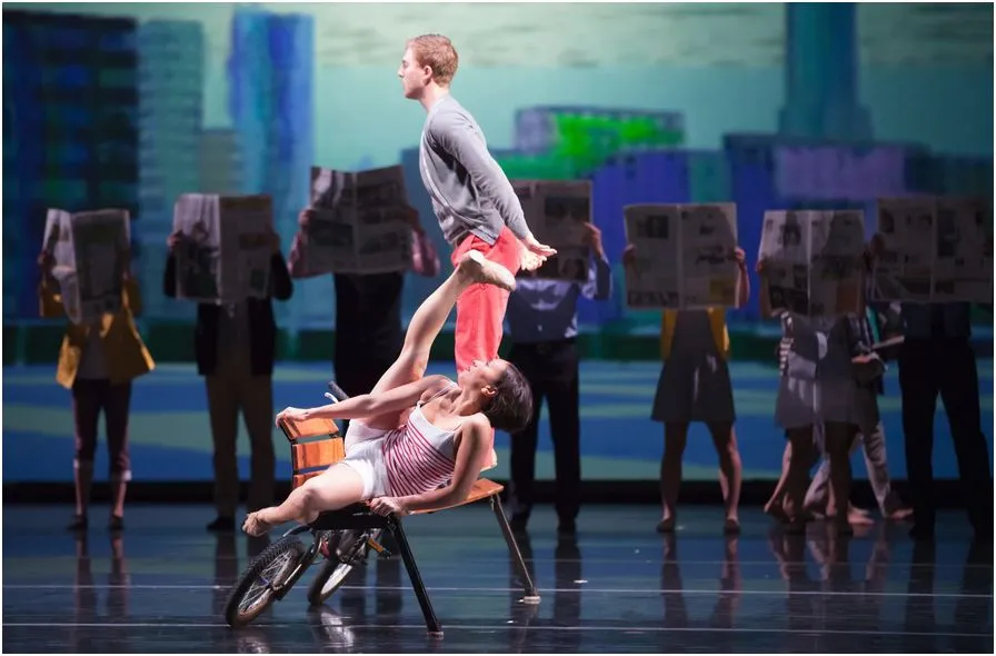 我试图描述一天的生活,包含[主题如]清晨咖啡、通勤、午餐、下午、晚上。舞者包括一对性感的雅皮士情侣、一家有两个孩子的工作家庭、一对年轻的朋克情侣、两个工作男士和一位单身女性。我试图识别城市中的人,或者我在城市中旅行时看到的。