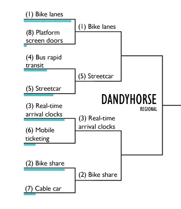 可怜的、不性感的BRT在丹迪马车中被街车以57-43的投票结果击败。现在,我们固定导向最爱面临更严峻的考验:自行车道,在第一轮中获得了第二多的投票。