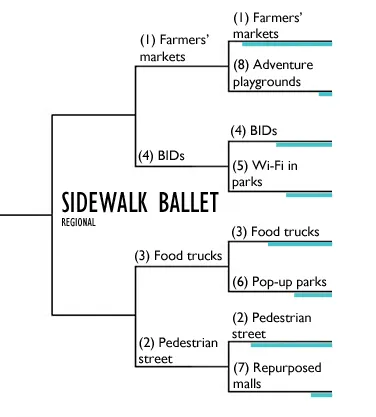 “人行道芭蕾”保持辉煌,四场比赛中顶级种子均获胜。商业改善区与公园中的Wi-Fi有过紧密接触——谁不喜欢免费的互联网呢?——但以55-45的优势胜出。食品车以65-35战胜快闪公园;步行街以77%的选票通过,农贸市场以88%的选票获胜。