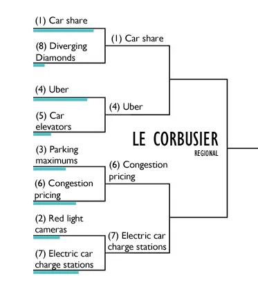 LC区域在周末发生了一半的冷门,电动汽车充电站以67%的选票击败红灯摄像头,获得了甜蜜十六强的席位。拥堵定价也以稍小的58-42的差距颠覆了停车上限。在顶部,分歧钻石获得了15%的选票——这是八号种子表现最好的成绩——而最终输给了共享汽车,后者将在下一轮对阵优步。