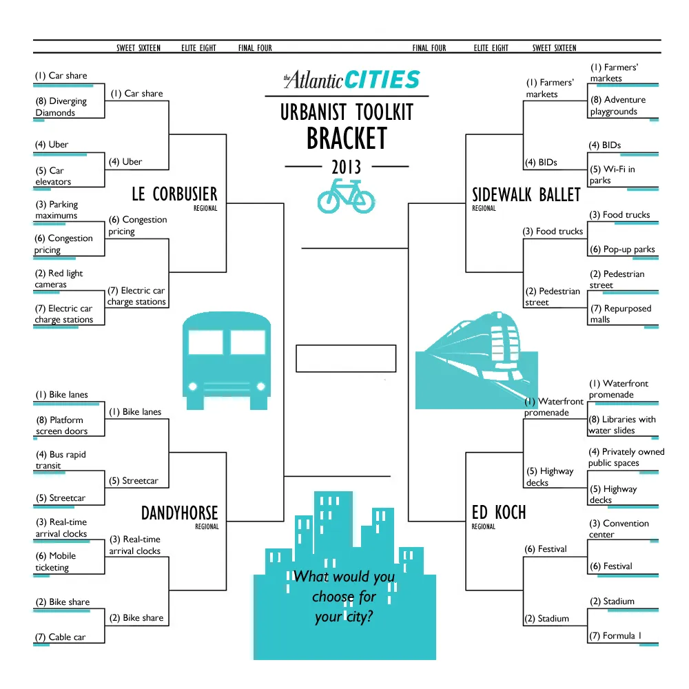 哈丽特·特雷戈宁,哥伦比亚特区的规划主任,选择了商业改善区、街车、拥堵定价和海滨长廊作为她的最终四强。她认为街车将赢得一切(恰如其分,因为华盛顿明年将有街车投入使用),并在边缘备注:“要素:汽车共享、自行车道、街车、实时到达、自行车共享、商业改善区。”