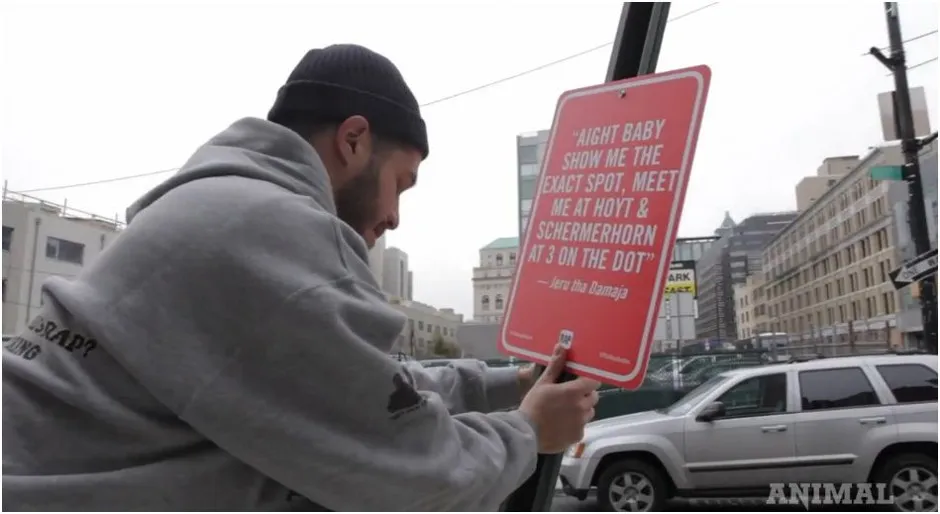 Shells的抒情干预与纽约的60个标志就在你面前的景观融合得很好。然而,根据一部由Animal New York拍摄的有趣纪录片,他因此至少收到了一个停止和停止信件。(也许那是因为在布鲁克林警察局外张贴了一首关于毒品的韵律?)但他似乎并不担心,告诉Animal:“这件事的好处是,我觉得如果警察来问什么,这很容易就能解释清楚。就像,‘好吧,我会把它拿掉!’然后我们10分钟后再回来把它放回去。”