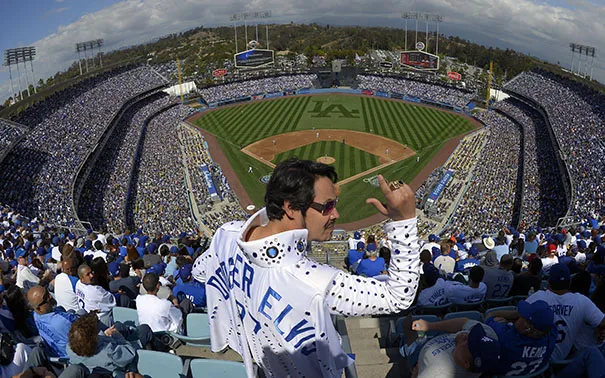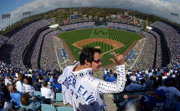 丹尼·德尔·托罗,也被称为“道奇猫王”,在2013年4月1日星期一洛杉矶道奇队与旧金山巨人队的开幕日棒球比赛中激励球迷,在洛杉矶的道奇体育场。美联社照片/马克·J·特里尔