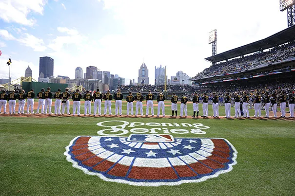 棒球迷在2013年4月1日星期一于PNC公园参加匹兹堡海盗队与芝加哥小熊队的开幕日棒球比赛前,站立奏国歌。美联社照片/基思·斯拉科西克